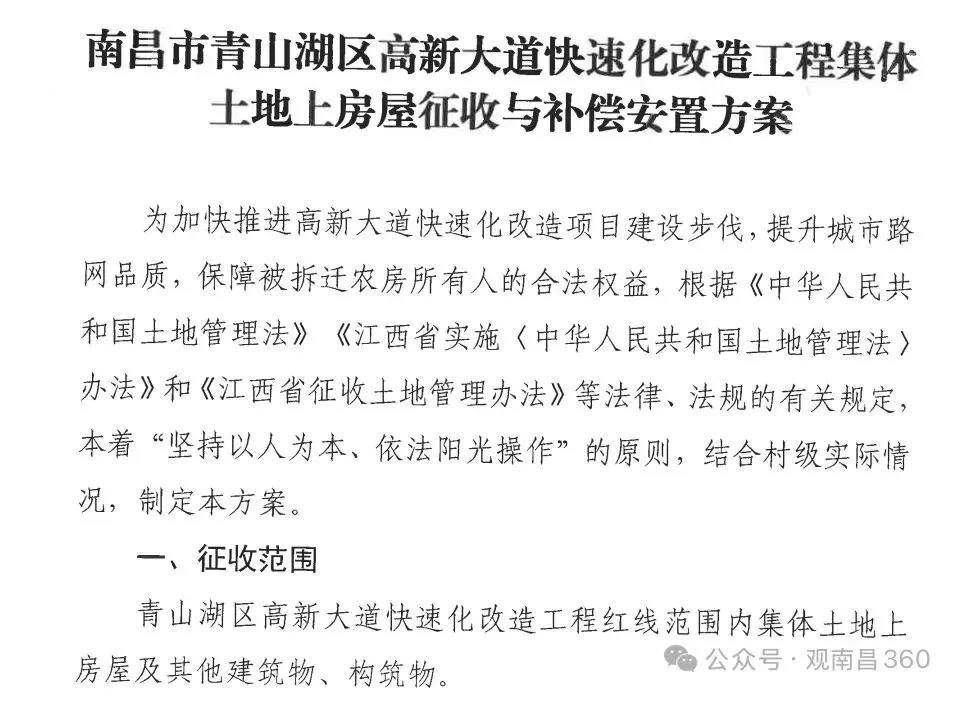 近日,南昌市青山湖区【高新大道快速化改造】工程集体土地房屋征收与补偿安置方案正式发布。征收对象为项目红线内村民住宅、村集体及企业房屋所有权人。