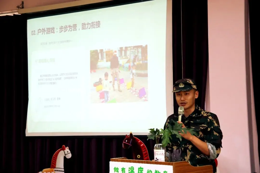 户外游戏《步步为营,助力衔接》,主讲人是南昌县丹蒂莱恩江奥幼儿园的章文杰老师。该活动以幼小衔接为核心导向,精心设计了一系列军警红色户外挑战项目,兼顾趣味性与教育性,章文杰老师合理规划户外场地,明确游戏规则,引导幼儿分组参与、协同合作,在趣味游戏中锻炼幼儿的规则意识、合作能力、肢体协调性和耐力,帮助幼儿逐步适应小学的集体活动节奏,培养良好的行为习惯,为幼儿顺利衔接小学筑牢体能与习惯双重基础。