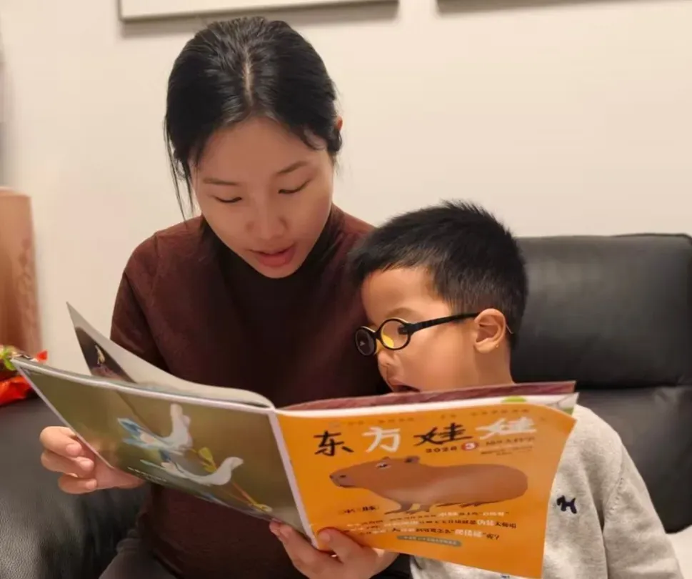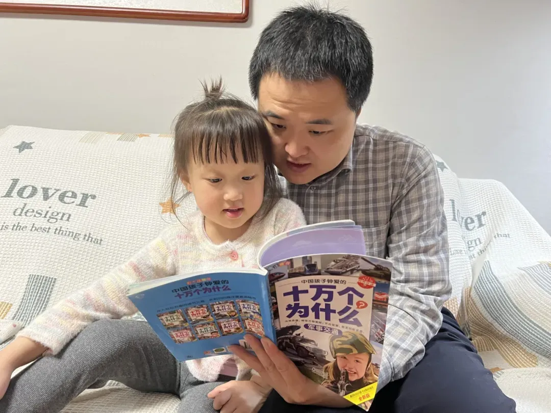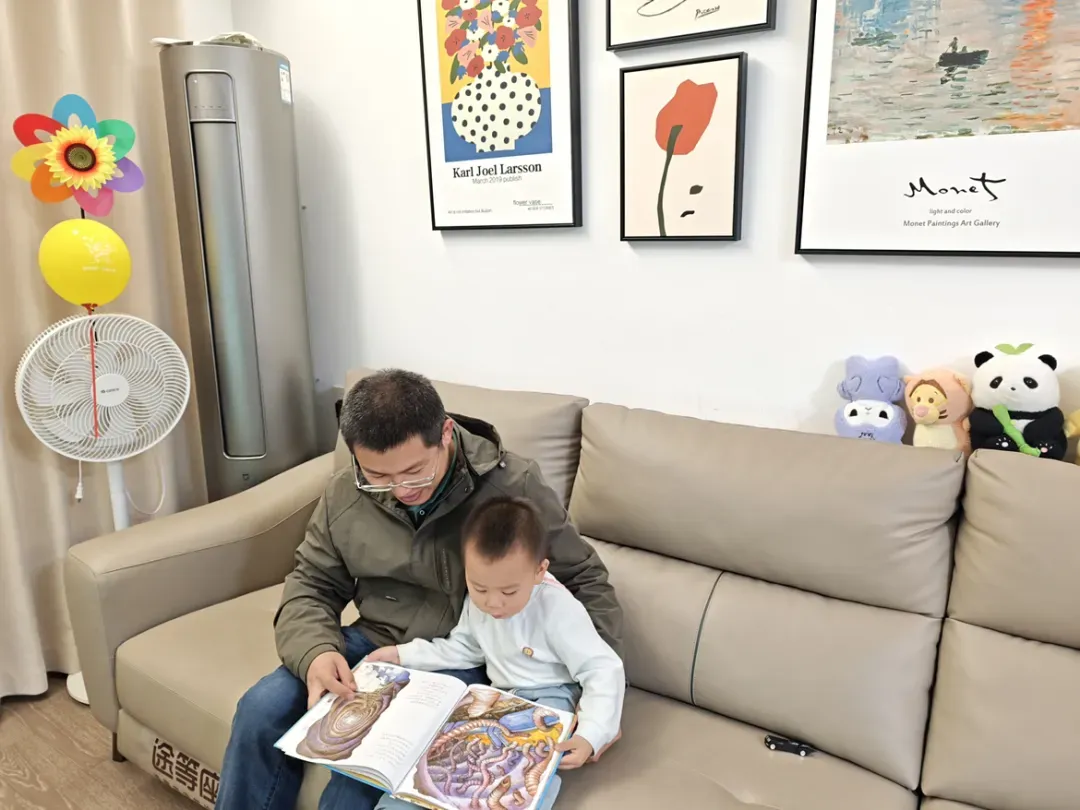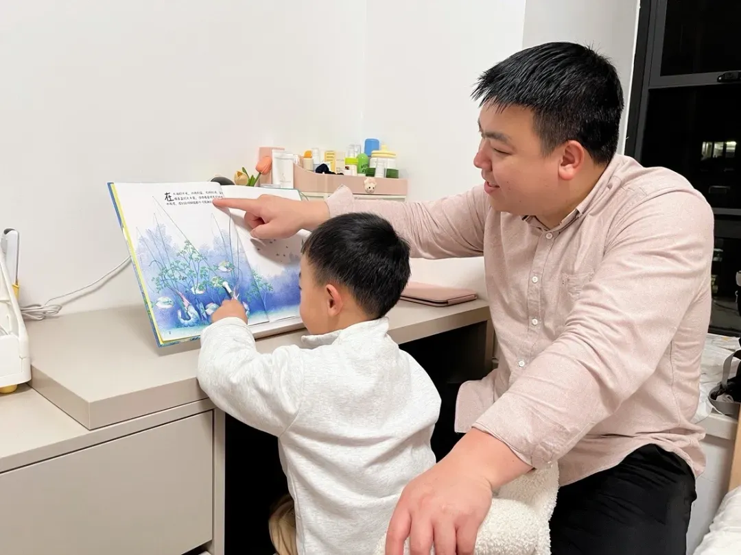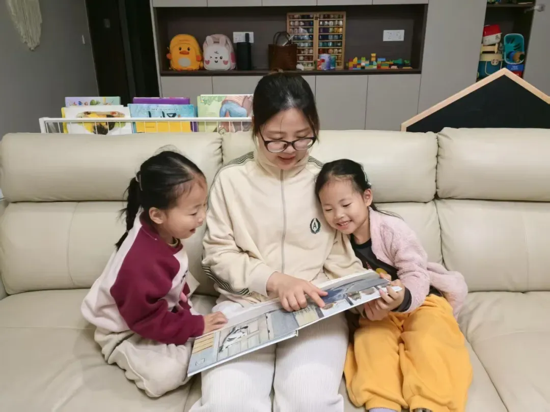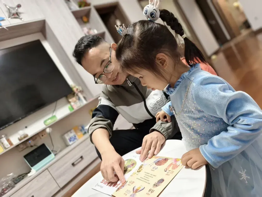 许多家庭积极响应,爸爸妈妈们放下手机,与孩子依偎在一起,共读一本绘本。温馨的灯光下,亲子间通过故事分享情感,画面充满了爱与温暖。