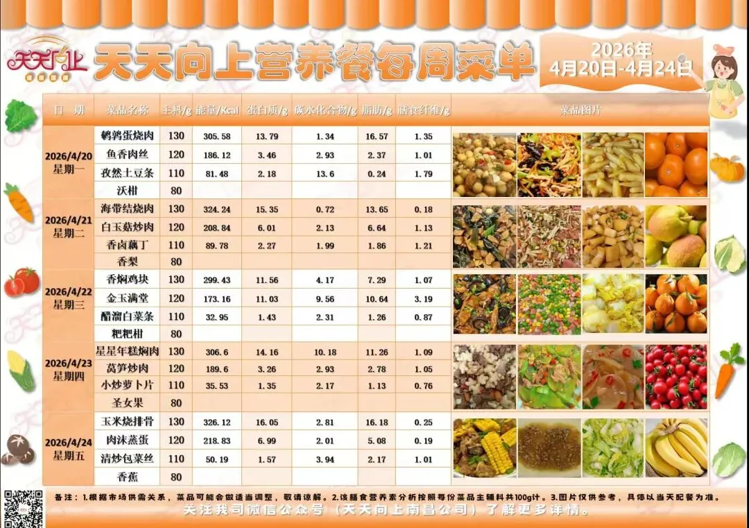 根据《南昌市中小学(幼儿园)配送餐管理办法》和相关精神,现将本校2026年4月20日—2026年4月24日菜谱公示如下: