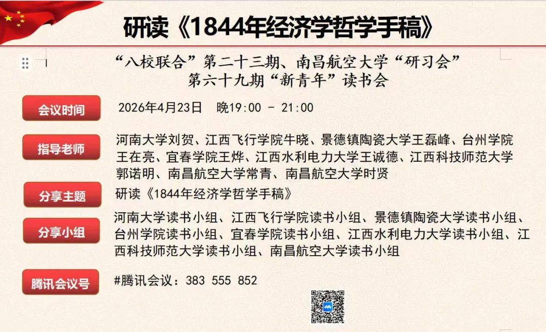 “八校联合”第二十三期、南昌航空大学“研习会”第六十九期“新青年”读书会将于2026年4月23日晚19:00-21:00召开,分享主题为研读《1844年经济学哲学手稿》。