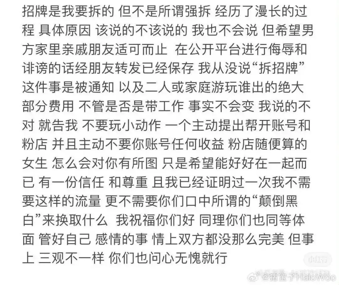 那我们必然不买账,这是什么意思的呢?虽然双方均为明说具体原因,但大家都猜测可能是利益纠纷的问题,毕竟又是拆招牌、又是男方亲戚、又是旅游费女方出大头,这个事应该挺复杂。也纷纷指责男方一家拎不清状况,靠猪宝子变得有流量起来就开始飘了
