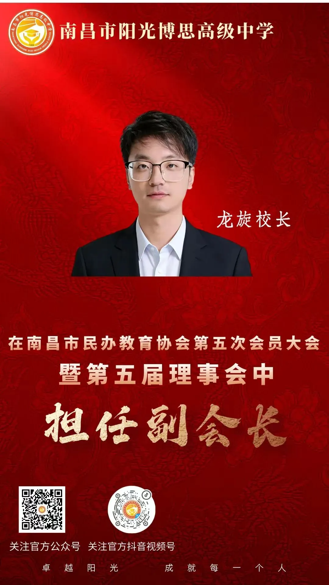 时序更替启新章,凝心聚力向未来。为进一步凝聚行业发展共识、优化协会治理体系、引领民办教育高质量发展,2026 年4月19日上午,南昌市民办教育协会第五次会员大会暨第五届理事会一次会议隆重召开,大会以 “守正创新启新程、聚力赋能谱新篇” 为主题,全面总结协会过往工作成效,科学谋划未来发展路径,圆满完成换届选举各项议程,为南昌市民办教育高质量发展凝聚新共识、注入新动能。我校龙旋校长在此次会议中,被评选为南昌市民办教育协会第五届理事会副会长。