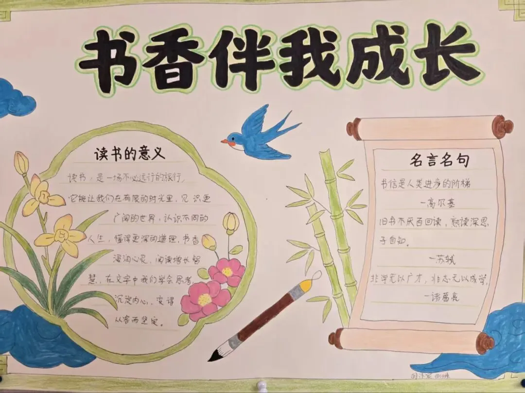 校园阅读广播站开设读书专题栏目,推送优秀书目、朗读经典片段、分享阅读感悟,用声音传递书香。同时,同学们精心制作阅读手抄报,将读书名言、好书介绍、阅读心得绘于纸上,展现阅读收获与创意。