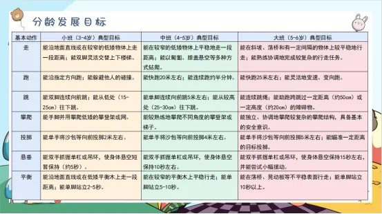 同时,围绕小、中、大班幼儿动作发展特点,细化平衡、钻爬、跑跳、投掷等基本运动能力分龄目标,帮助教师精准把握指导要点,提升观察、支持与回应的专业能力。
