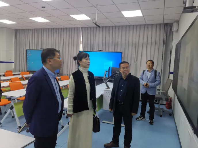 在南昌大学,外国语学院党委书记李忠、院长陈夜雨、副院长姚琴及相关人员热情接待了吴芹一行,带领参观了智慧语言实验室、同声传译实验室和智慧报告厅,详细介绍了数字化设备和教学运行情况。