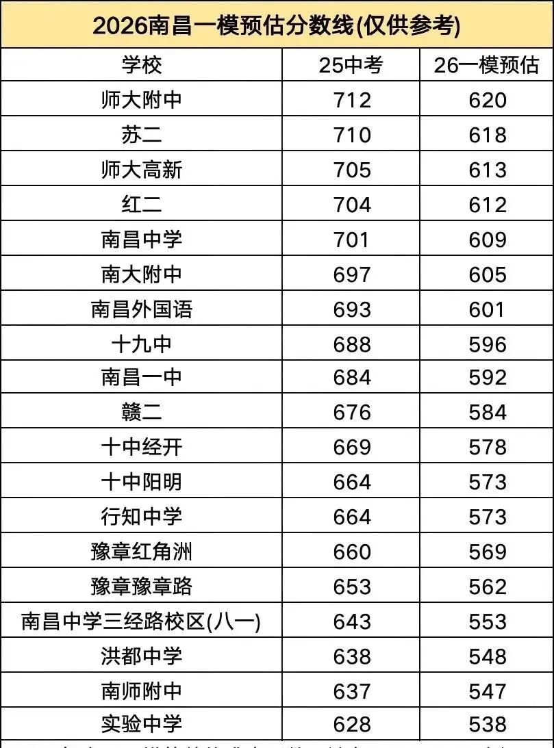 南昌2026初三一模分数线(预估)附2024和2025各高中统招录取分数对比
