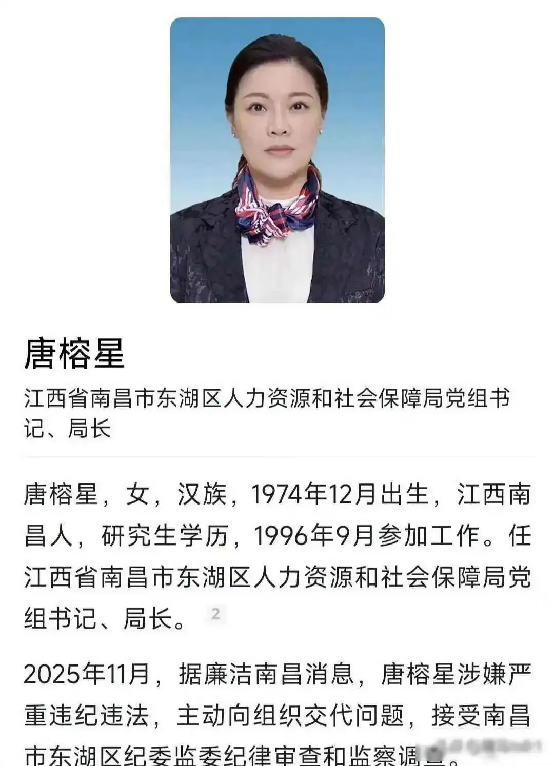2026年4月,南昌街头吃饭聊天的人总说起东湖区那个去自首的女局长,唐榕星三十五岁,去年秋天走进纪委大楼的时候,谁也没想到她平时看起来像二十出头的人会走到这一步,直到“廉洁南昌”发了通报,全区公务员的微信群一下全炸了,连奶茶店送单的小哥都晓得,那个穿香奈儿套装的局长出事了。