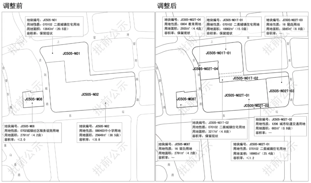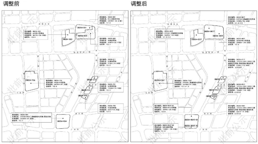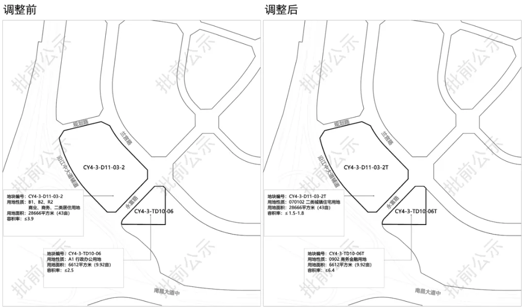 剩余的约53亩用地由两幅地块组成,调规前分别为容积率3.9的商业/商务/居住用地43亩+容积率2.5的行政办公用地9.92亩,调整后变成容积率1.5-1.8的住宅用地43亩+容积率6.4的商务金融用地9.92亩。