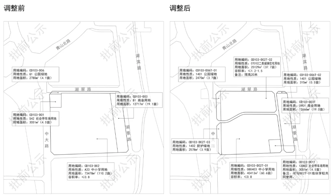 这次对青山湖西岸CD103-D单元局部地块调规,最主要的调整是占地面积110.2亩的中小学用地。调整后,保留60.6亩中小学用地即二中青山北路校区,新增一幅面积37.7亩住宅用地。
