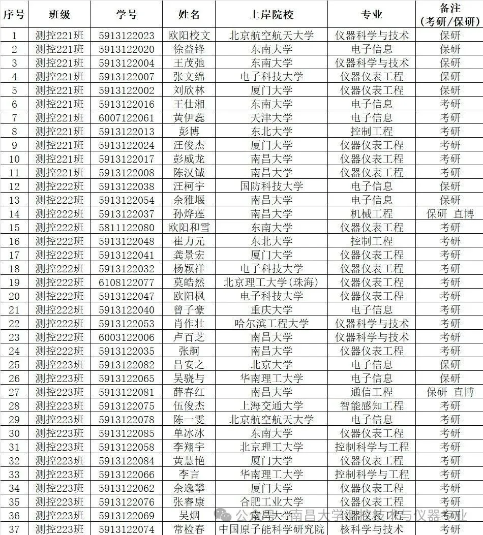 2026年考研已经进入尾声,南昌大学先进制造学院测控技术与仪器专业22级上岸人数再创新高,总体升学率达到44.58%,其中测控222班达到50%,受到大家瞩目。全专业83人,其中保研升学11人(含直博2人),考研升学26人。录取北京大学、上海交通大学、北京航空航天大学、东南大学、天津大学、国防科技大学、北京理工大学、电子科技大学、重庆大学、华南理工大学、东北大学、厦门大学、中国原子能科学研究院等一批“双一流”高校!