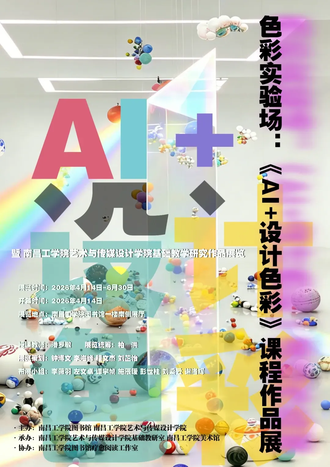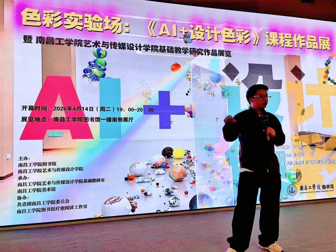 2026年4月,由南昌工学院图书馆与艺术与传媒设计学院联合主办,南昌工学院艺术与传媒设计学院基础教研室、南昌工学院美术馆承办,南昌工学院图书馆疗愈阅读工作室协办的“色彩实验场:《AI+设计色彩》课程作品展”,在图书馆一楼南侧美术馆顺利开展。