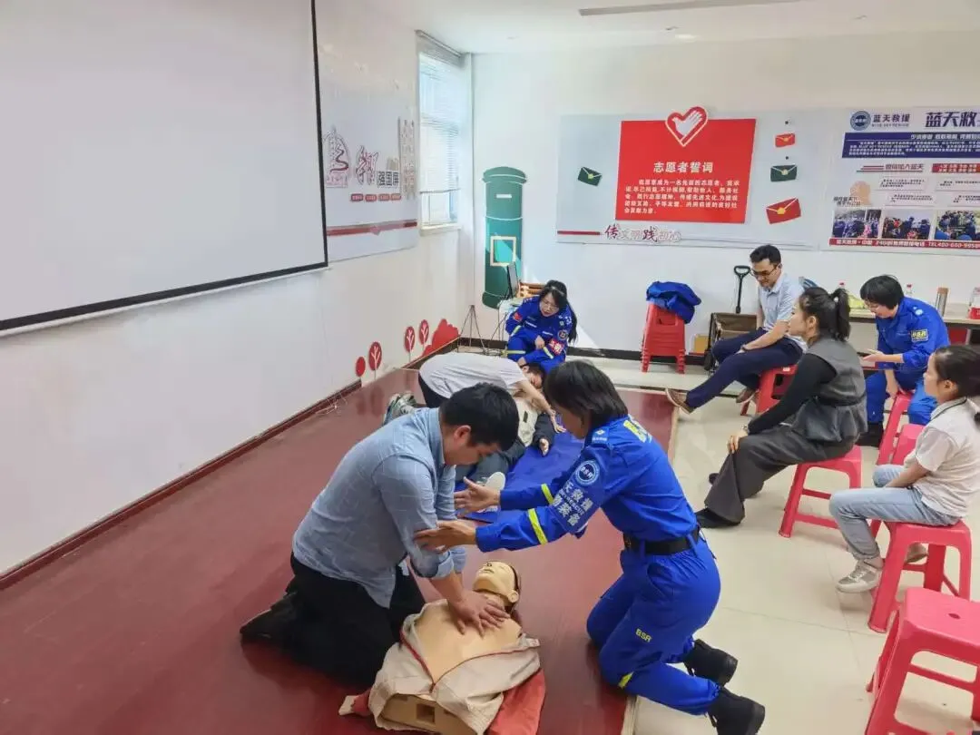 培训现场,南昌蓝天救援队专业讲师结合中年群体工作压力大、作息不规律等特点,用通俗易懂的语言,系统讲解心梗前兆识别、心搏骤停判断、呼吸道梗塞急救等核心知识。