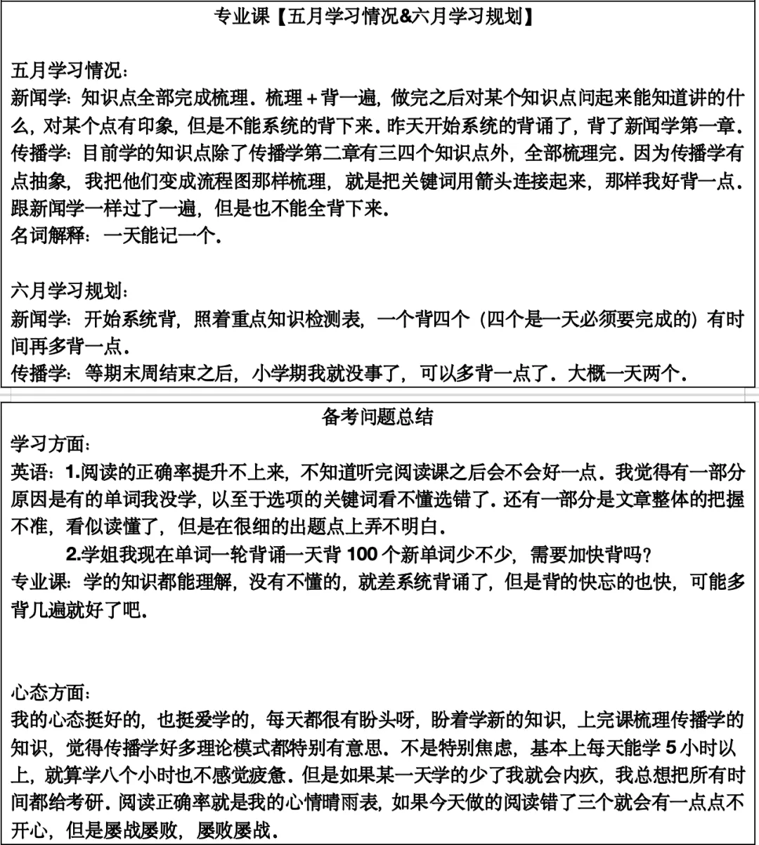 4-6月:因为我开始的有些晚所以我没有看过书,直接听的学姐的新闻学传播学的课。每次上完课我会再梳理一下知识点,自己写成思维导图+提取关键词,方便自己理解,像传播学绪论里面的各种传播模式刚开始学真的晦涩难懂,自己梳理一遍弄明白了到暑假背书也会轻松一些。学姐的课件上面也会有真题,能知道知识点是如何考察的,而且学姐上课还经常提问,能够扩展思路,到后面写题会发现思路打开真的很重要。我是五月下旬开始练习名词解释的,学姐会在群里发打卡任务,这期间要练习自己想角度,每种类型的名词解释可以写的角度不同,比如学者要写著作+理论+贡献这些,像一些现象类要写积极消极影响。总之,无论是论述还是名解角度都很重要。