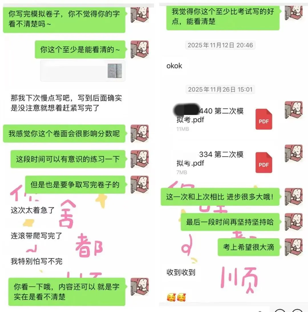 第一次模拟考时,我留意到学妹的字迹有点乱看不清,这在阅卷中确实可能会影响分数。不过在我提醒过她一次之后,第二次模拟考她就立马做出了改正。有这样的学习态度再加上良好的心态,她怎么可能考不上呢!