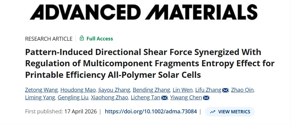相关研究成果以Pattern-Induced Directional Shear Force Synergized With Regulation of Multicomponent Fragments Entropy Effect for Printable Efficiency All-Polymer Solar Cells为题,发表在国际顶级期刊Advanced Materials上声明:本文仅供科研交流,非盈利用途。若存在侵权或疏漏,请联系删除。文中可能AI生成内容仅供参考,欢迎批评指正。