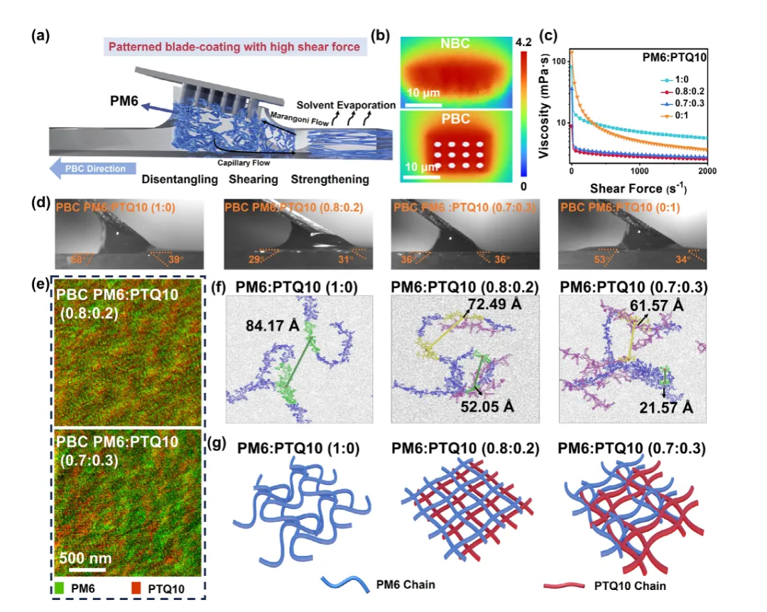 传统的刮涂工艺在溶剂蒸发阶段剪切力会耗散,导致聚合物链无序。该研究利用图案化刀片(Patterned Blades)在印刷过程中对流体进行空间限域。这种物理结构迫使聚合物溶液在受限空间内流动,显著增强了沿印刷方向的定向剪切力(Directional Shear Force)和流体速度。这种增强的剪切力有效地拉伸了PM6聚合物链,使其从无序卷曲状态转变为有序伸展状态,从而在宏观上实现了大面积薄膜的均匀印刷,在微观上促进了聚合物链的有序堆积。