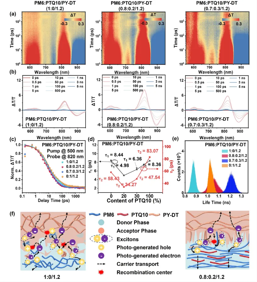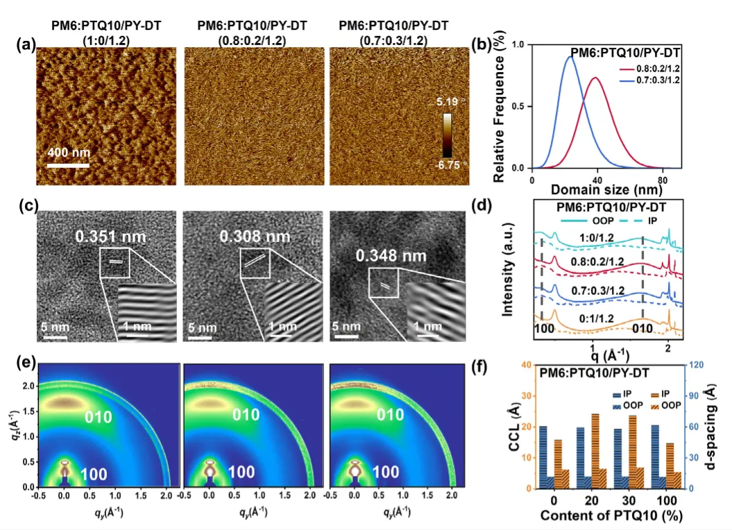 在溶剂蒸发阶段,聚合物链通常会发生熵驱动的回缩(Entropy-driven retraction),导致过度聚集和非晶相的形成。文章引入了第三组分PTQ10,利用其相对刚性的分子链结构。PTQ10片段能够与PM6片段有效结合(Bind),这种结合作用在溶液蒸发过程中充当了“锚点”,抑制了PM6片段的熵致回缩效应。这种机制将主导行为从“链回缩”转变为“纤维聚集”,从而缓解了PM6的过度聚集,稳定了有序的分子堆积结构。