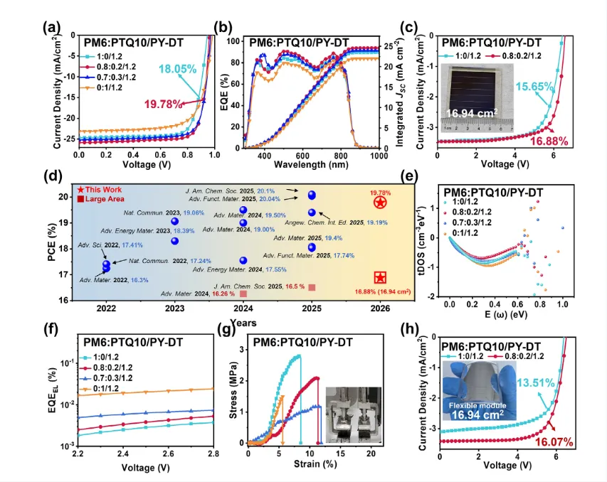 该策略不仅在实验室小面积器件上取得了19.78%的极高效率(Fill Factor接近80%),更重要的是在大面积柔性模组上展现了巨大的应用潜力。研究制备的16.94 cm²柔性模组实现了16.08%的效率,且柔性器件保持了刚性器件95.6%的效率。这一创新点证明了该协同策略在解决“效率-面积-柔性”三者矛盾方面的有效性,为全聚合物太阳能电池的商业化应用提供了可靠的技术路径。