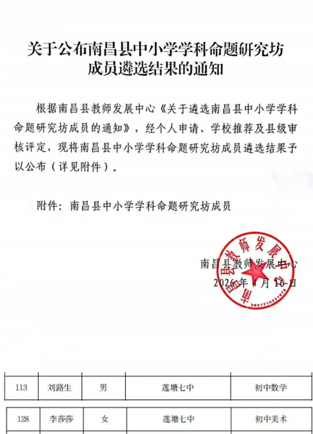 近日,南昌县中小学学科命题研究坊成员名单公布,我校数学教师刘路生、美术教师李莎莎凭借优秀的专业能力,成功入选!