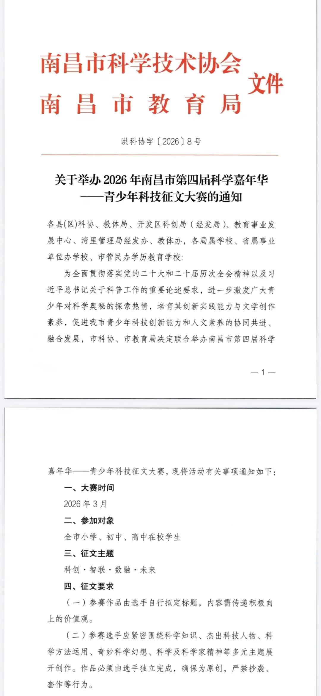 近日,由南昌市科学技术协会、南昌市教育局联合举办的 2026 年南昌市第四届科学嘉年华青少年科技征文大赛圆满落幕。南昌市豫东学校教育集团豫东校区学子在本次赛事中奋勇争先,斩获多项荣誉。其中,梅锦源老师指导学生朱泽宇的作品《旧收音机与智能音箱的二重奏》荣获市级初中组三等奖,张义荣老师指导学生余婧恩的作品《科学点亮梦想,创新成就未来》荣获市级小学组三等奖,充分展现了我校学子深厚的科学素养、丰富的创新思维与优秀的文字创作功底。