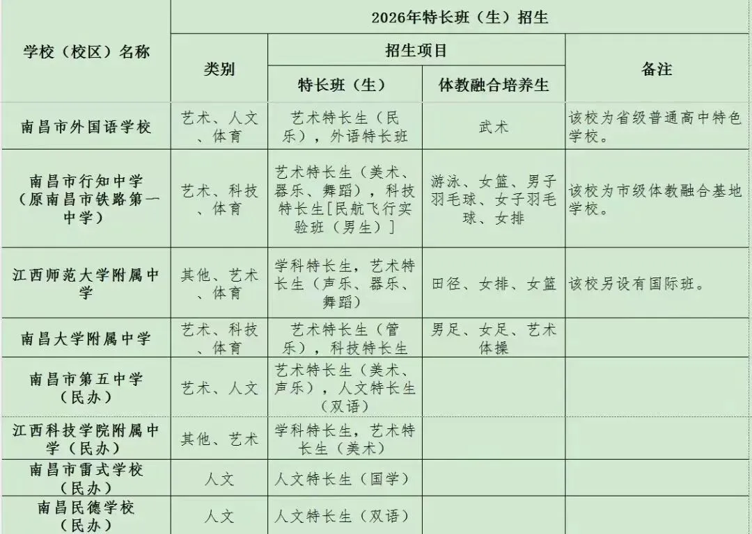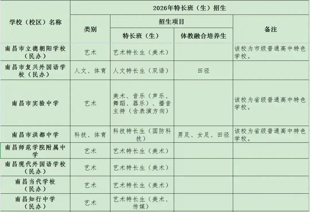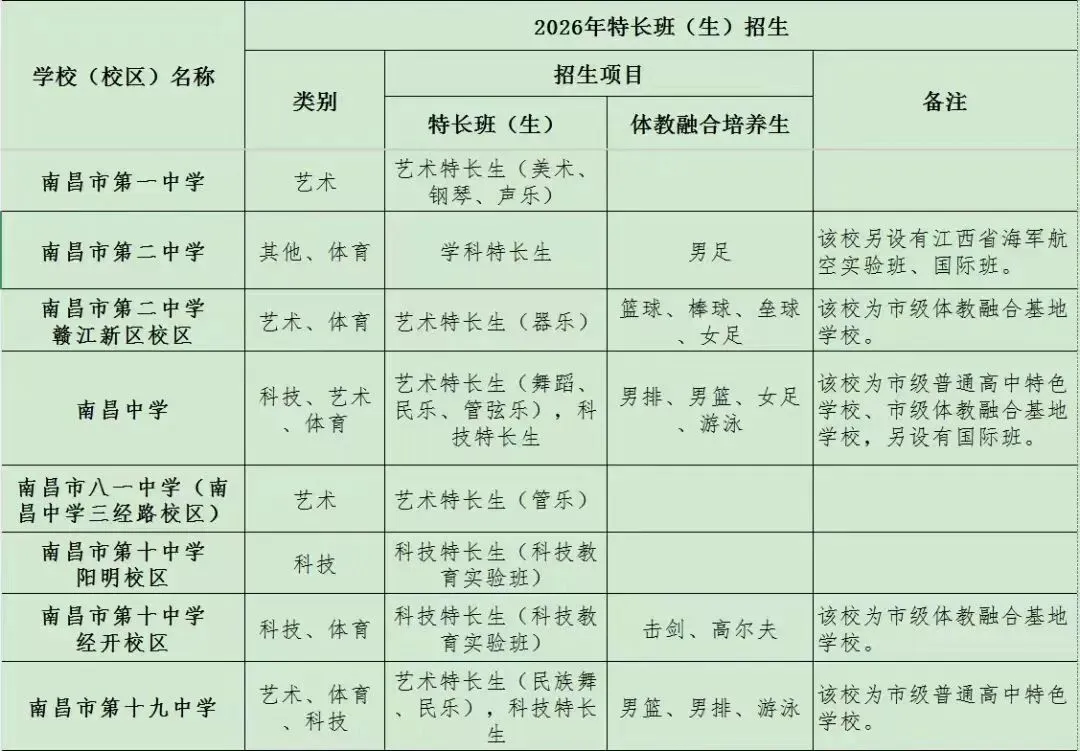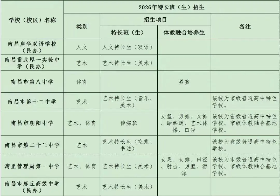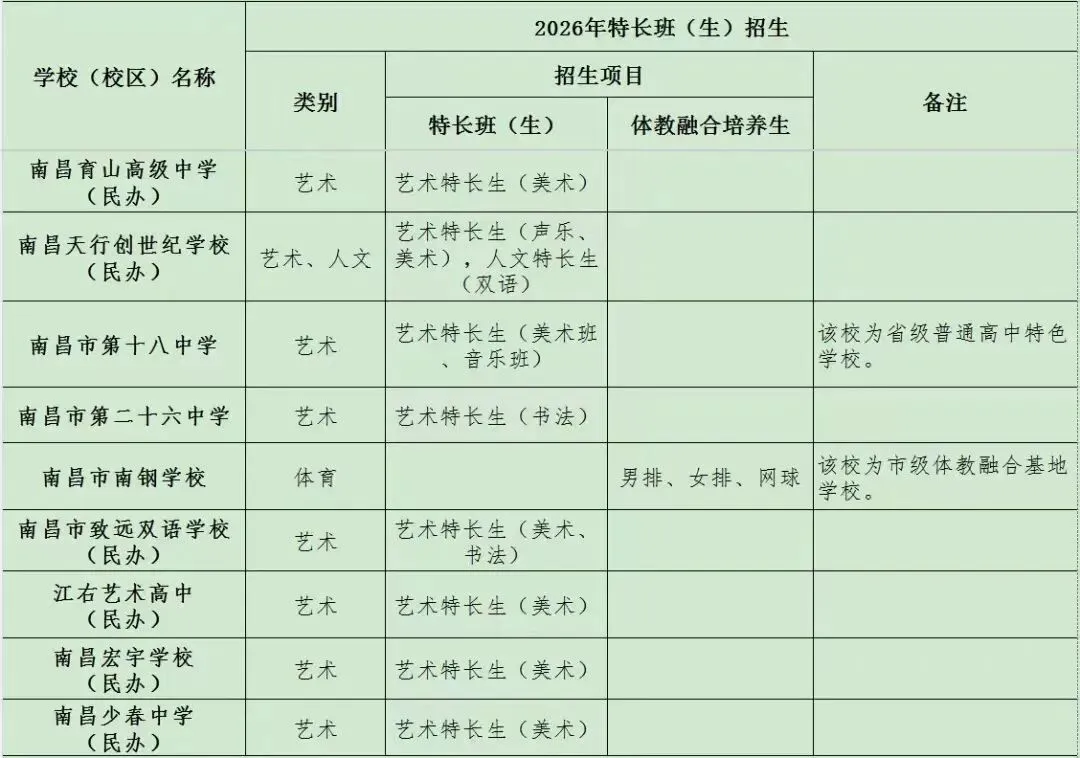 >2026年南昌城区普高特长生招生项目公布(最新)